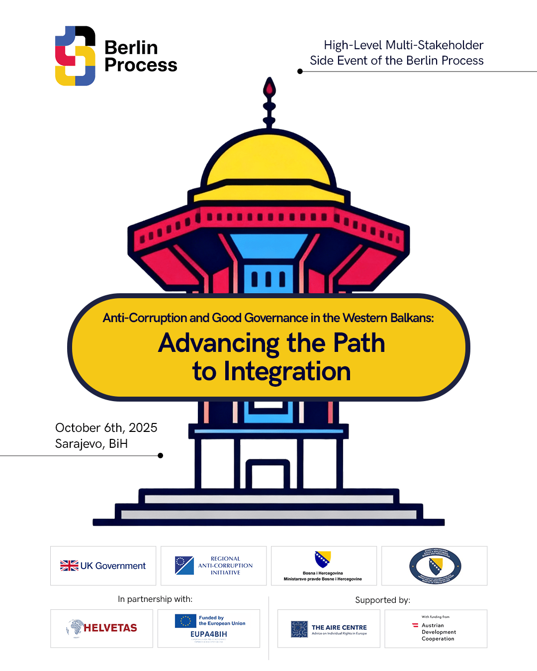 The Government of the United Kingdom, the Regional Anti-Corruption Initiative (RAI), the Ministry of Justice of Bosnia and Herzegovina, and the Ministry of Foreign Affairs of Bosnia and Herzegovina, together with partners HELVETAS Swiss Intercooperation (HELVETAS) and the EU Support to Police in BiH Project (EUPA4BiH), and with the support of the AIRE Centre – Western Balkans Program and the Austrian Development Agency (ADA), are co-organizing a high-level regional event: